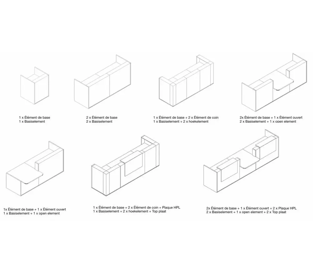 - De basiselementen, hoekelementen en open elementen kunnen met elkaar verbonden worden. Zo kan u uw eigen balie op maat bouwen.