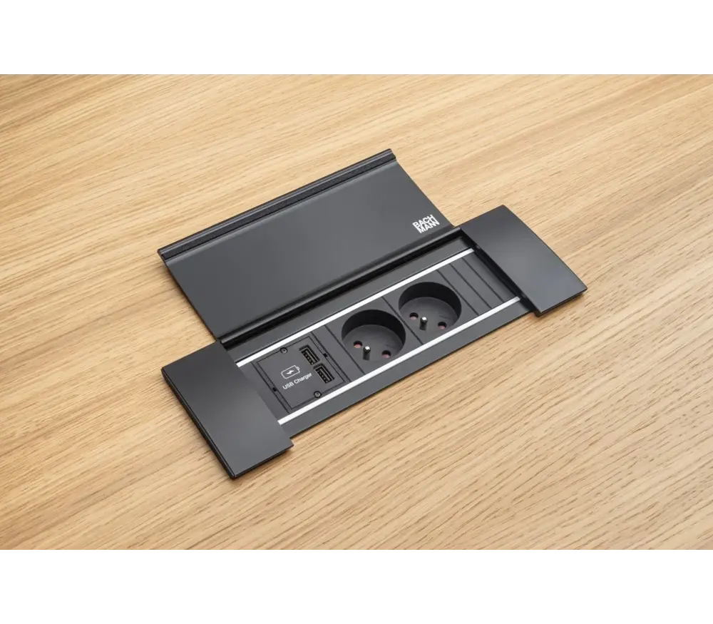 - Optioneel: Kabeldoorgang aluminium, Mediabox + kabeldoorgang(2x230V + USB), Frontpaneel en extra lade die afsluitbaar is