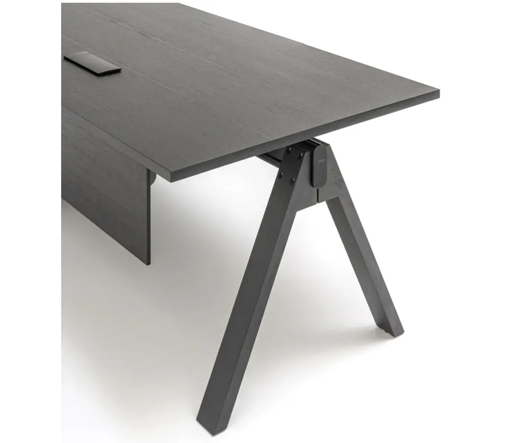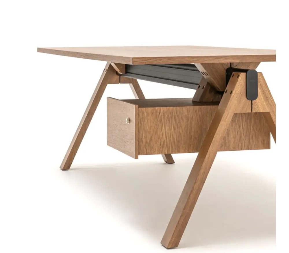 De keuze tussen eikenfineer of nadelige Fenix-afwerking zorgt voor een luxe-afwerking tegen vingerafdrukken. De aluminium kern biedt een elegante en stabiele basis. Kabelbeheer is eenvoudig dankzij geïntegreerde oplossingen. De optionele zijkasten helpen documenten discreet op te bergen zonder het minimalistische karakter van het bureau aan te tasten.