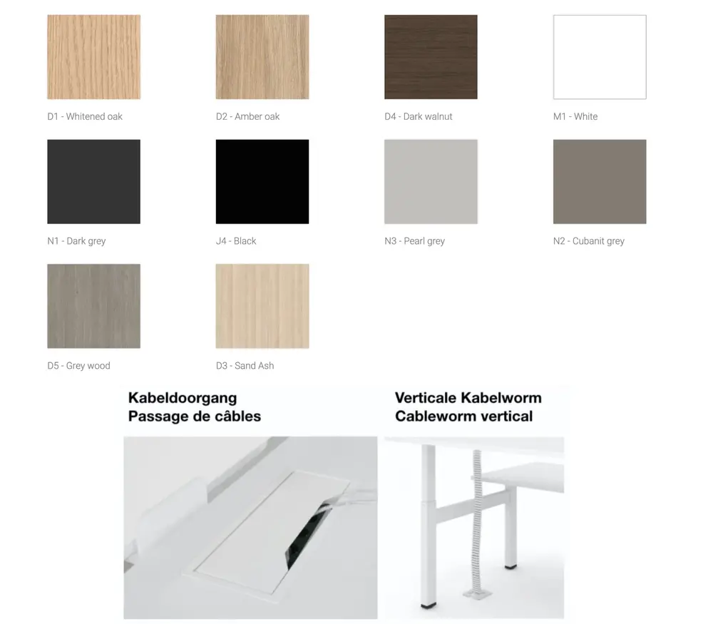 - Kabelbeheer: kabeldoorgang bureau, kabelmand onder bureau, verticale kabel, metalen laden en CPU houder zijn optioneel