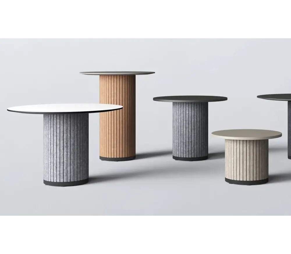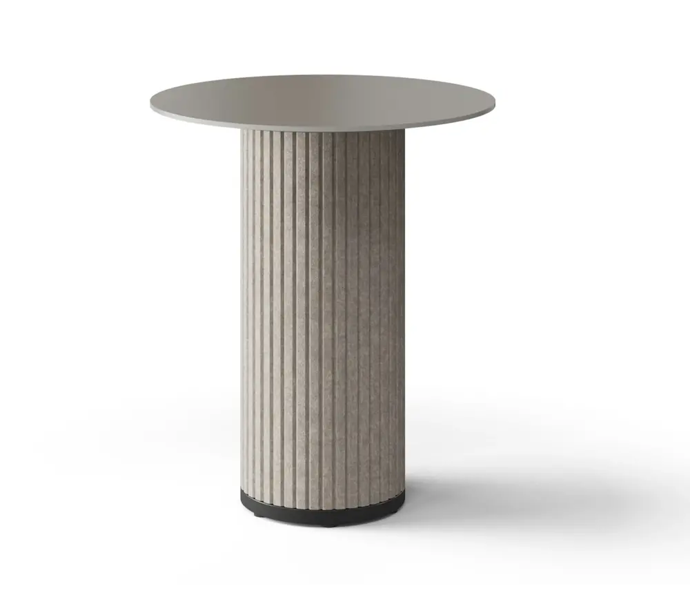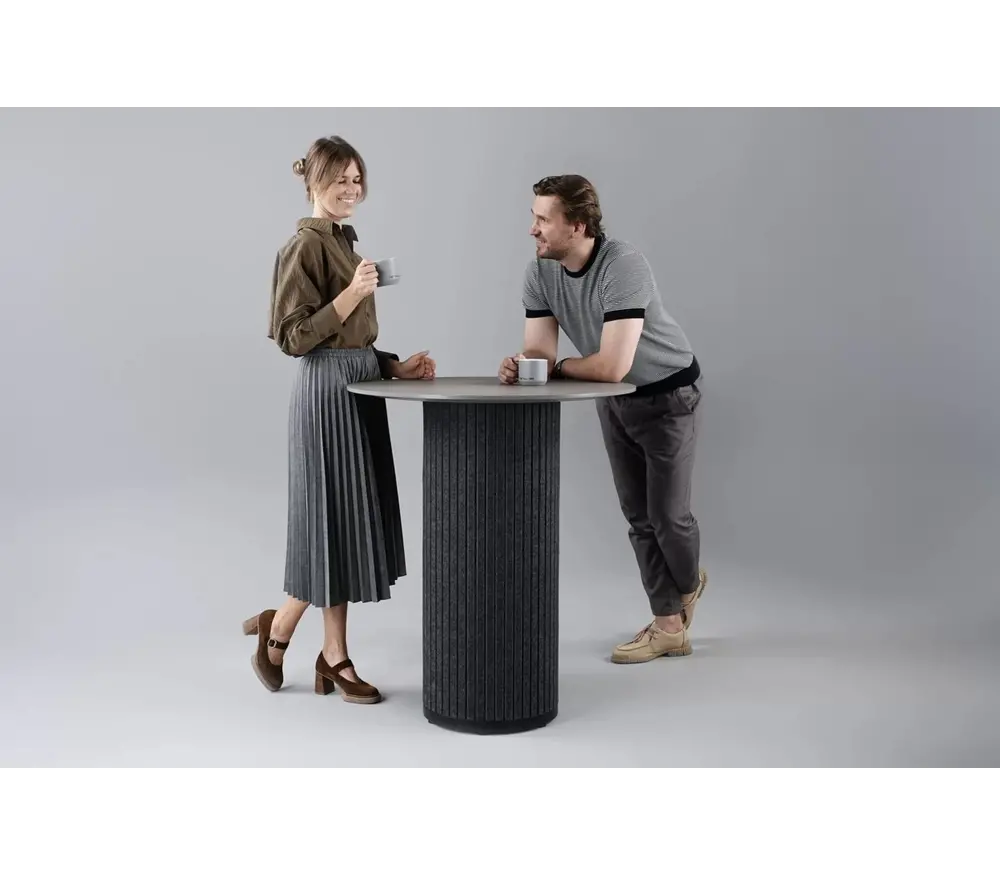 Deze ronde eettafel heeft een cilindervormige zuil bekleed met PET-vilt, wat zorgt voor stabiliteit, een verfijnde uitstraling en functionele voordelen. De tafel voldoet aan de LST EN 15372:2017 normen en is deels vervaardigd uit post-consumer PET, wat bijdraagt aan duurzaamheid.
