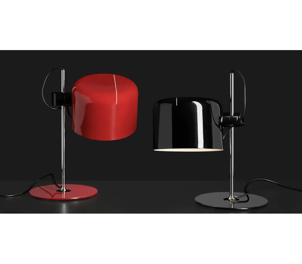 De Oluce Coupé 2202 bureaulamp van de legendarische Joe Colombo heeft eenspecialesemi-cilindrische reflectorinmetaal.