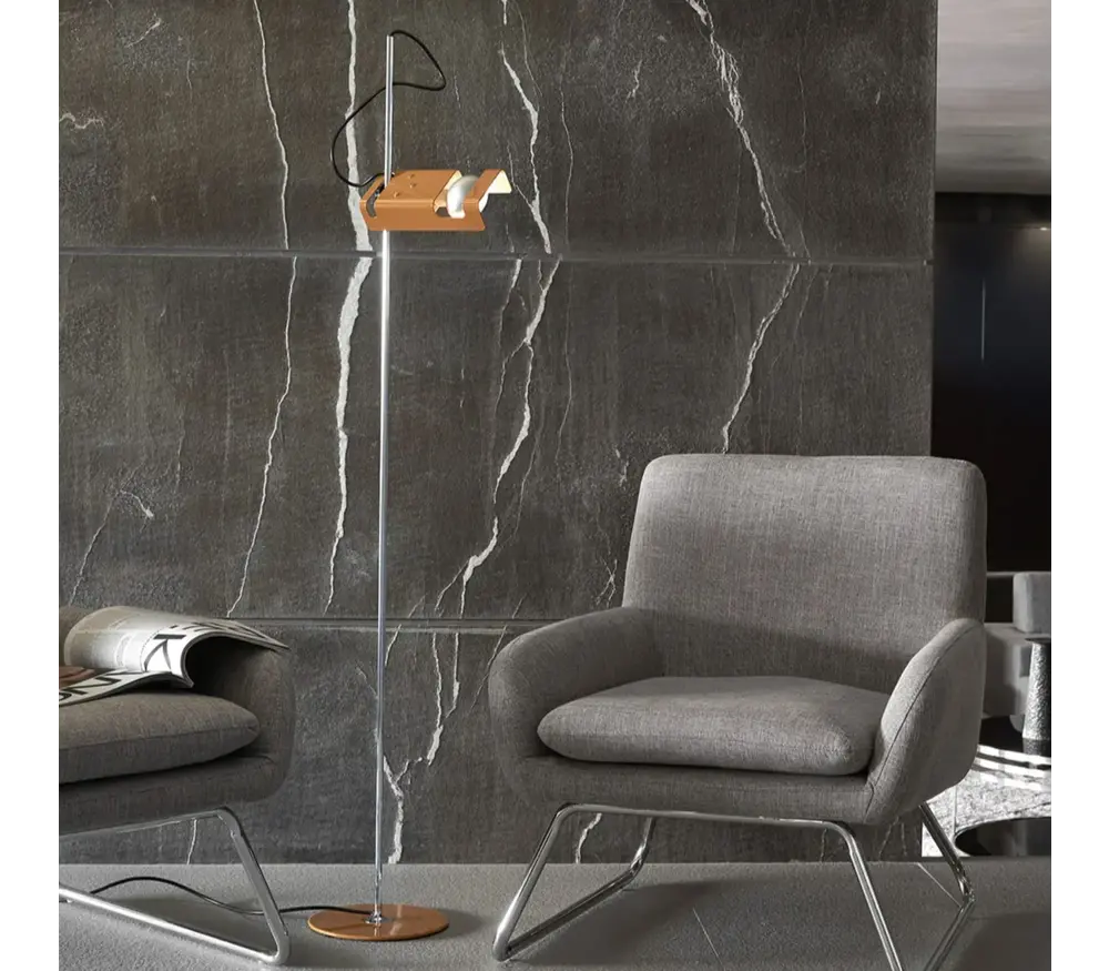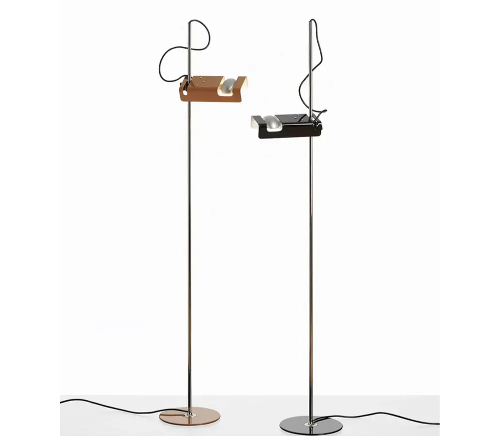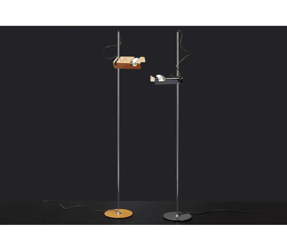 De Oluce Spider 3319 staanlamp die met een reflector doelbewust werd ontworpenom de specialehorizontalespotvan de gloeilamp te benadrukken is een klassieker.