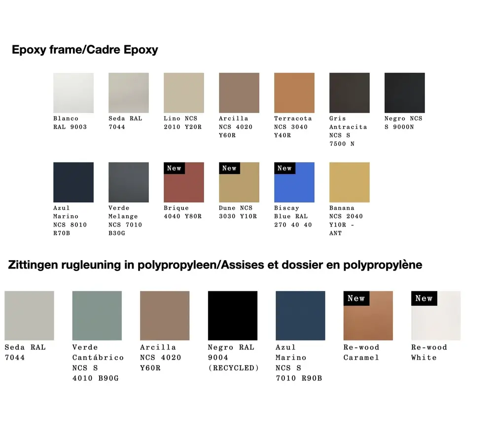- Materiaal: Metalen structuur en polypropylene zitvlak en rug. Op aanvraag verkrijgbaar in stof.