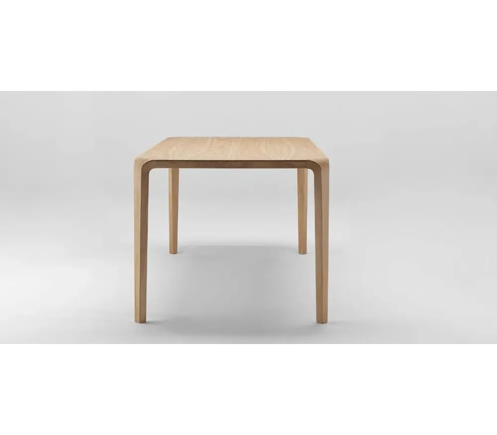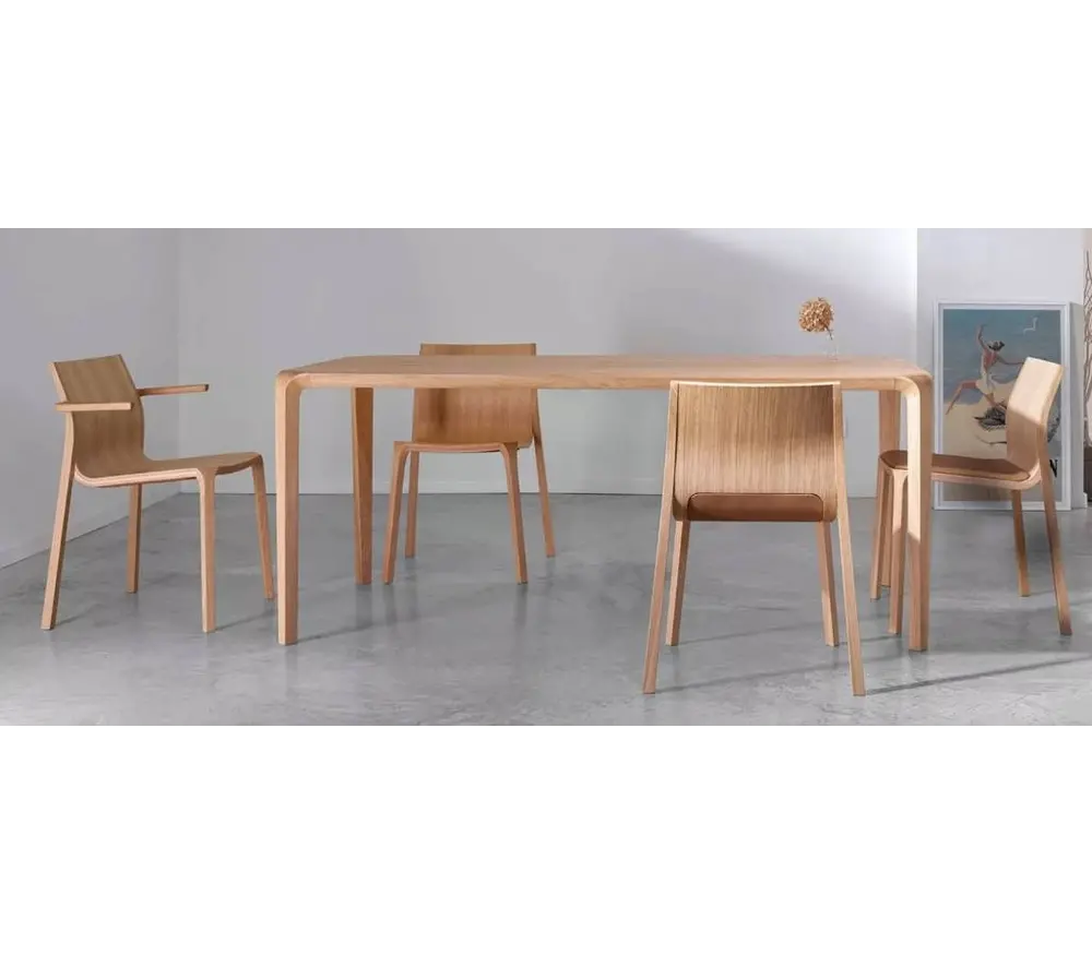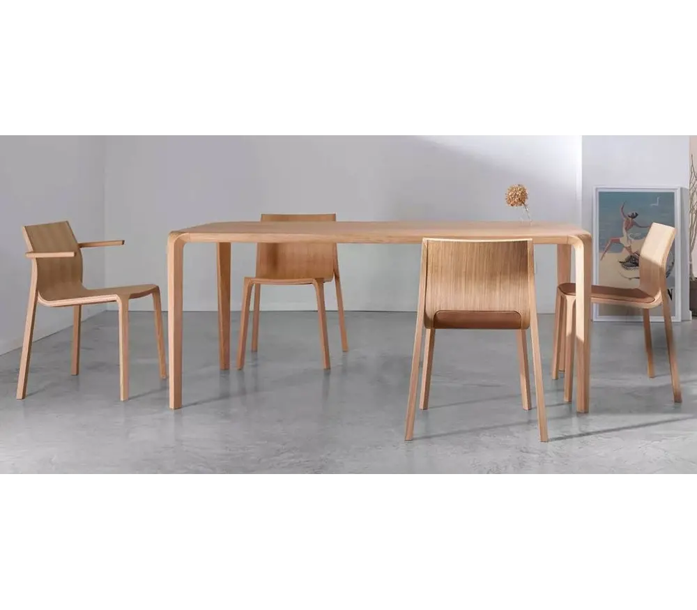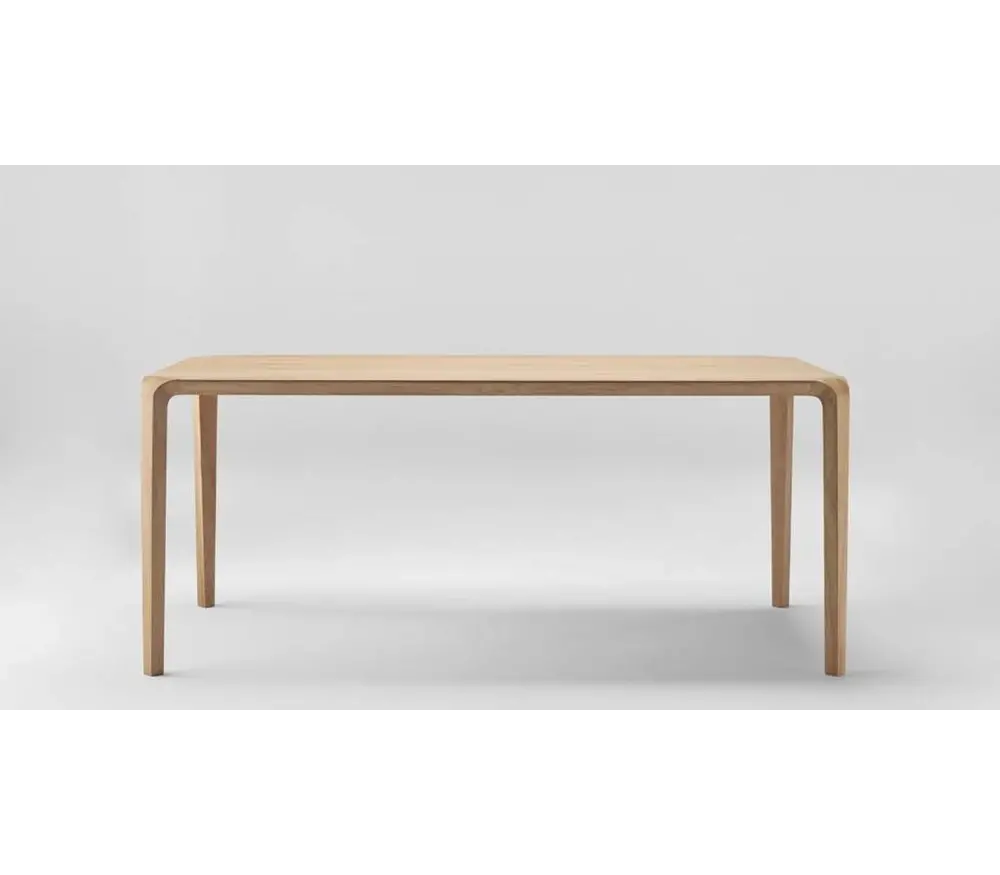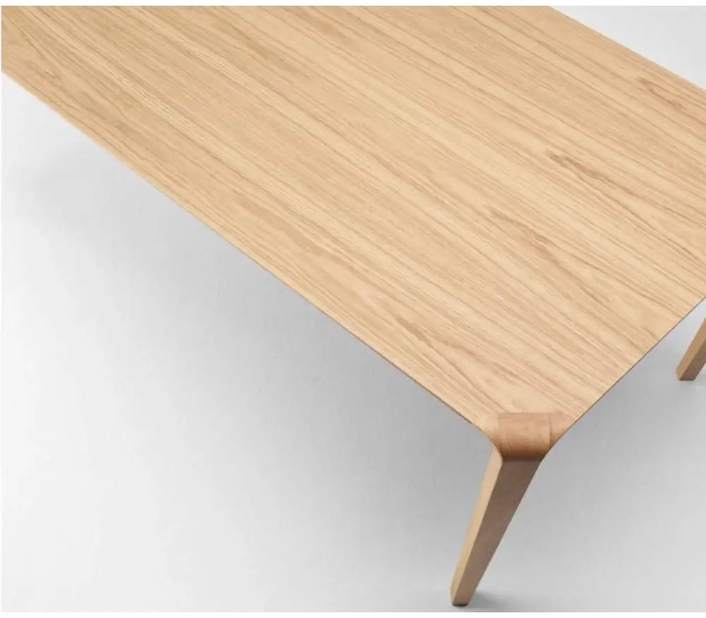De houten tafel is ontworpen met een gekleurde eikenhouten basis en de vorm van de tafel is het resultaat van een traditionele gebogen houttechnologie en state-of-the-art design.