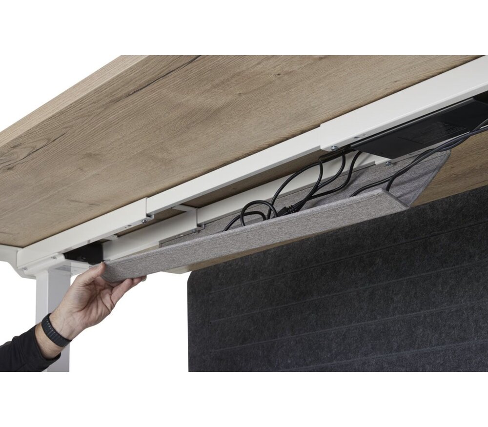 Kabels en elektronica worden netjes weggewerkt in de meegeleverde magnetische kabelbak onder het blad. Wie extra kabelmanagement wenst, kan optioneel kiezen voor een kabeldoorvoerdop, aluminium klep of een kabelmand/kabelkorf onder het werkblad.