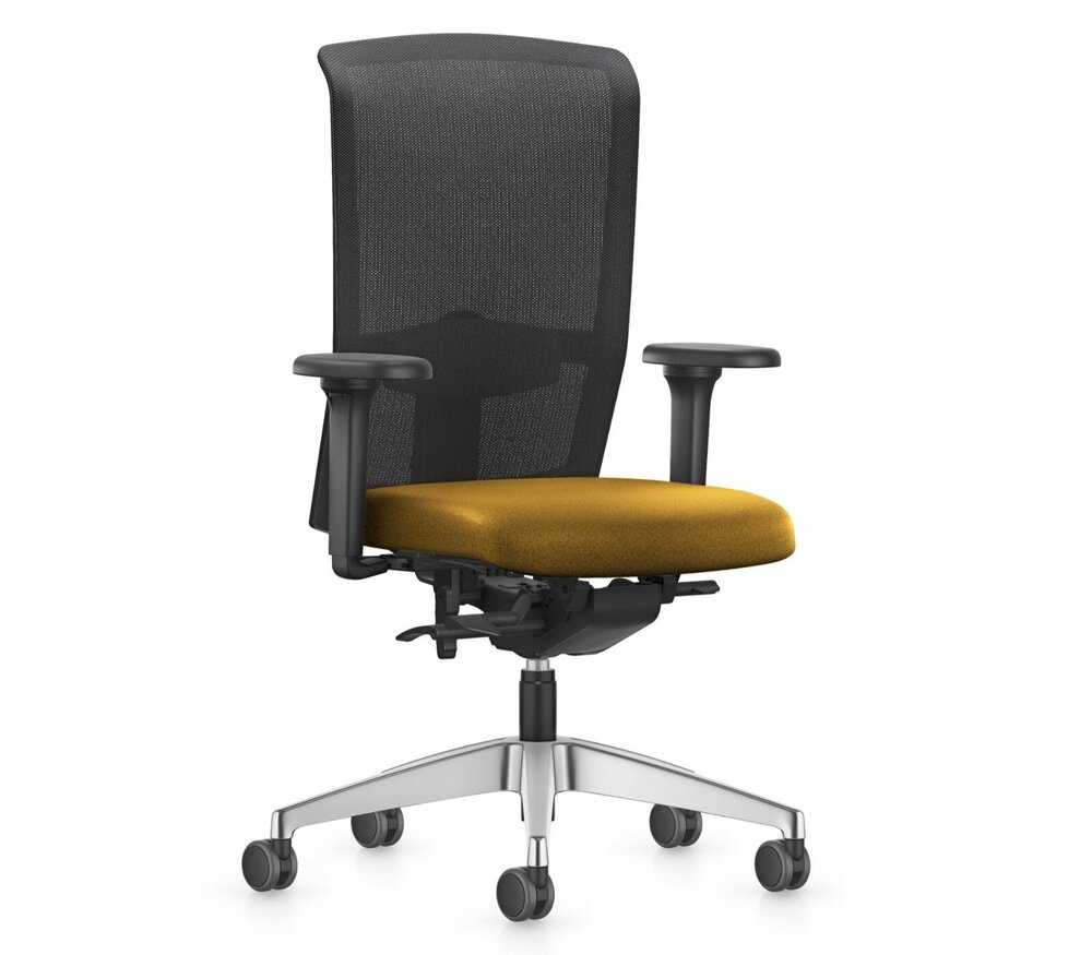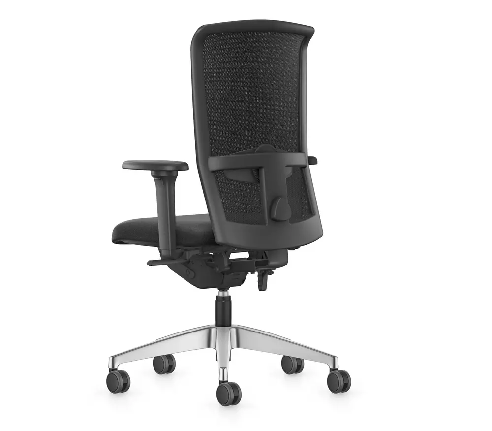De rugleuning is uitgevoerd in ademende netbespanning, wat zorgt voor optimale ventilatie en ondersteuning. De zitting is gestoffeerd in duurzame 100% polyester stof (Lucia).