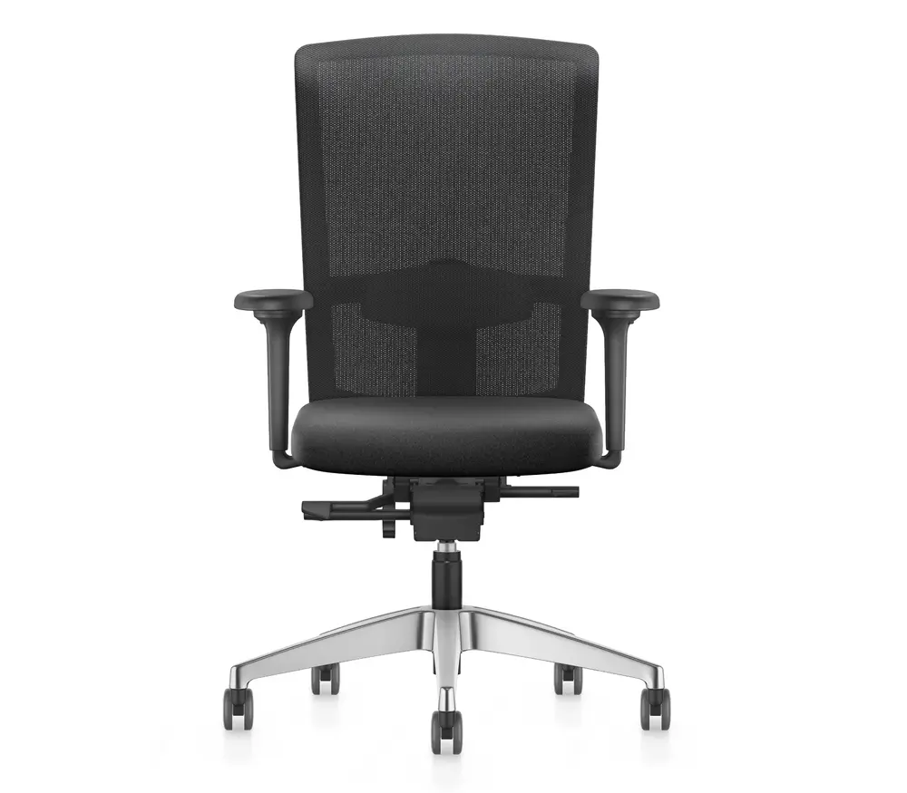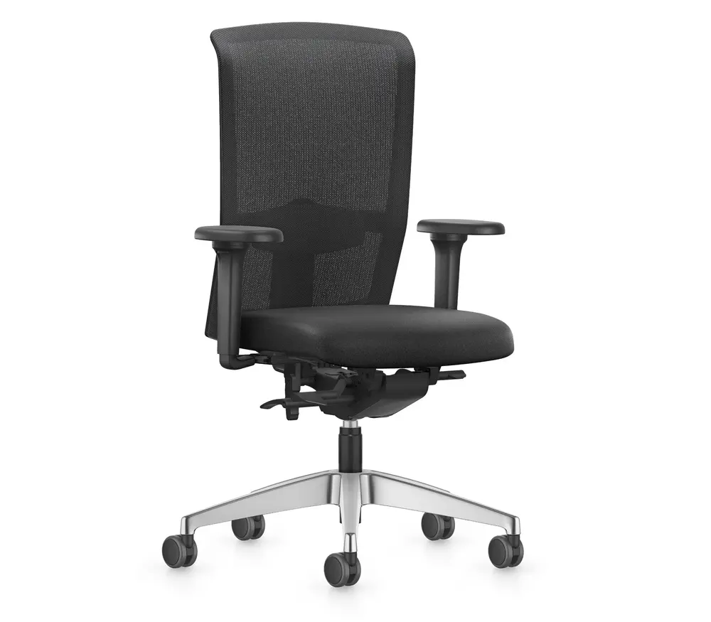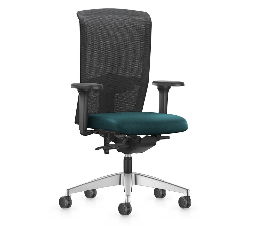 - Technische eigenschappen: NPR 1813, synchroontechniek met gewichtsregeling,vergrendelbaar, hoogteverstelling van de rugleuning, zitdiepteverstelling, zitneigverstelling, verstelbare lendensteun, NPR-armleggers (in hoogte, breedte en diepte verstelbare armleggers met zachte opdek, 360 graden draaibaar), voetkruis aluminium gepolijst, universele dubbele wielen