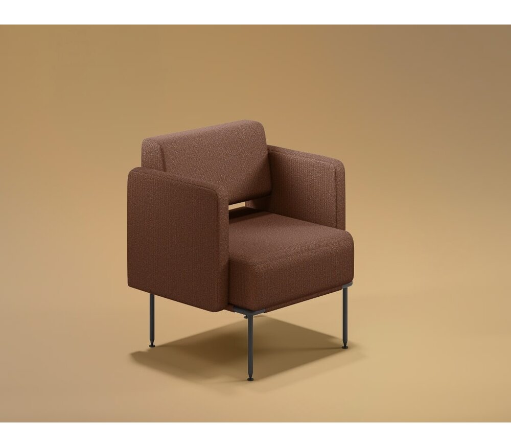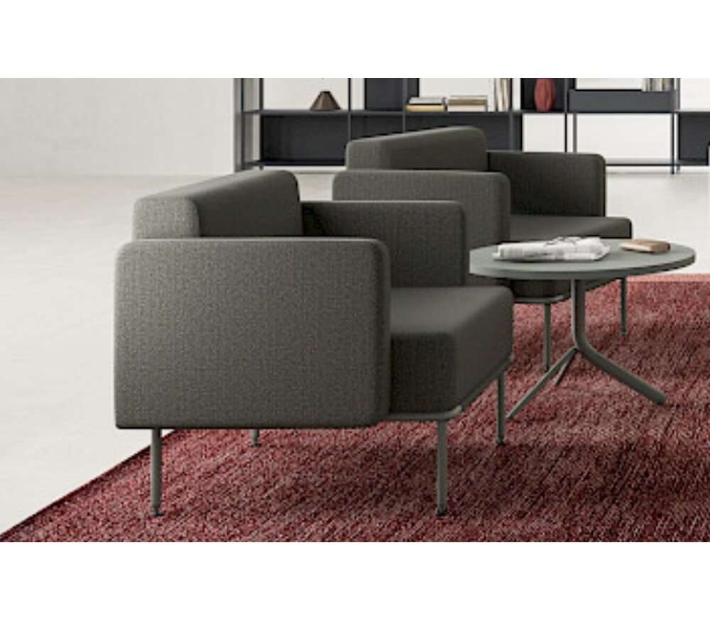 De zitkussens, armleuningen en rugleuning vormen samen een harmonieus geheel dat uitnodigt tot ontspannen zitten. Elk detail is doordacht – van de tubulaire stalen structuur tot de stoffen band die de zitting subtiel omarmt en visueel verbindt met het frame.