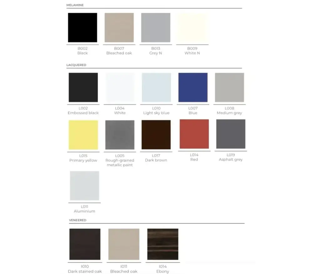 - Materiaal: Staal met aluzilver poedercoating, enkellaags veiligheidsglas 8mm, E1-spaanplaat met gelakeerde laag, frontpanelen in MDF en Multiplex