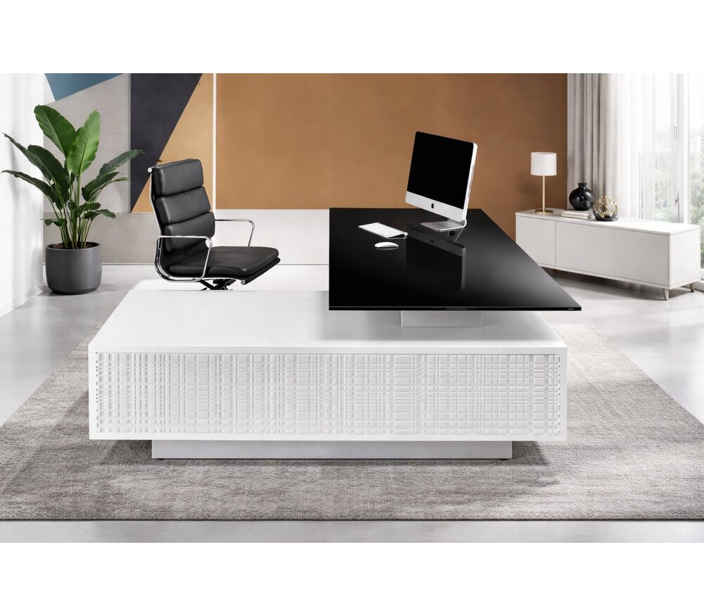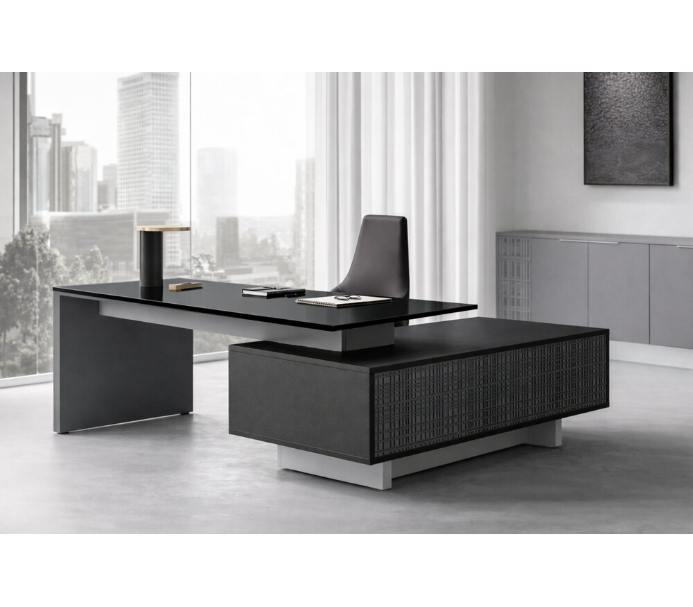 De Modi bureaucombinatie met glazen blad onderscheidt zich door zijn royale afmetingen en hoogwaardige afwerking. Met een breedte tot 220 cm en een diepte van 180 cm biedt dit bureau een indrukwekkende werkruimte die perfect aansluit bij de noden van een directiekantoor of executive omgeving.