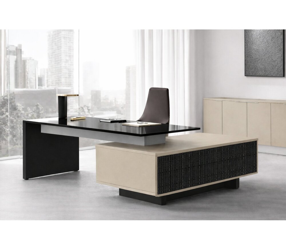 De Ultom Modi bureaus met glazen bureaublad en opleg-dressoir zijn een exclusieve bureaucombinatie op het hoogste niveau, ontworpen voor directieomgevingen waar uitstraling en functionaliteit samenkomen.