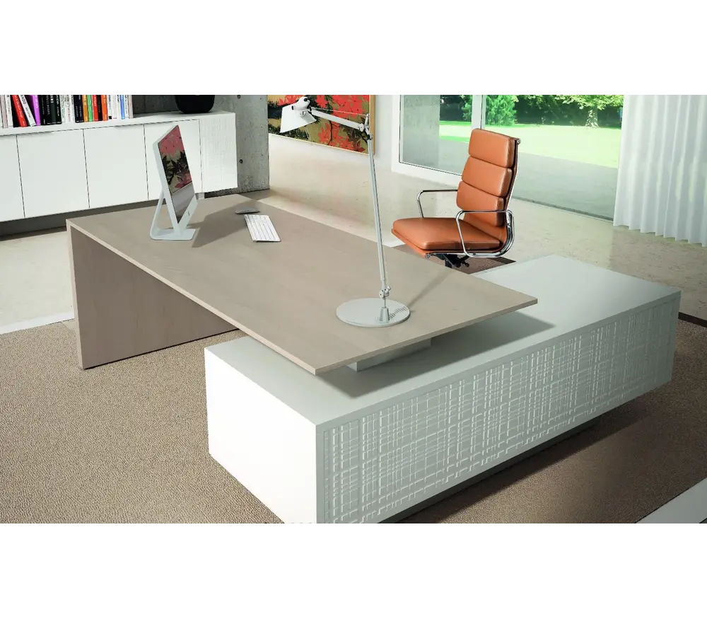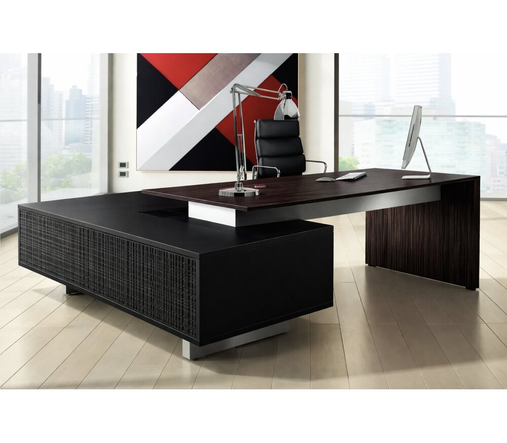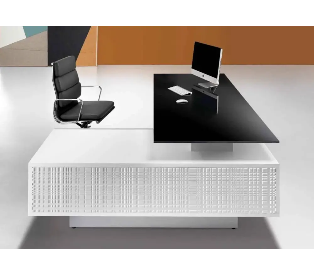 De combinatie van materialen zoals mat gelakt melamine, fineer hout en glas zorgt voor een luxueuze uitstraling. Afwerkingen zoals Zebrano, Wengé of zwart glas geven het bureau een uniek karakter en maken het mogelijk om het perfect af te stemmen op de stijl van het interieur.