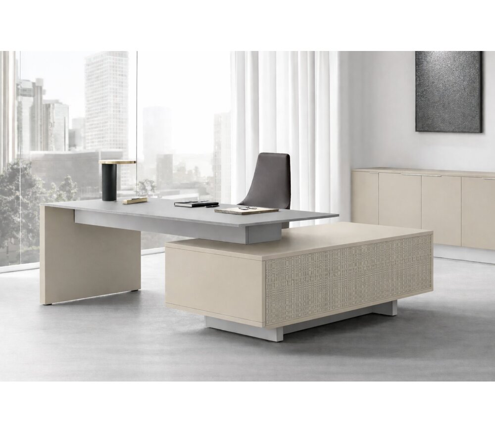 De Modi bureaucombinatie onderscheidt zich door zijn royale afmetingen en hoogwaardige afwerking. Met een breedte tot 220 cm en een diepte van 180 cm biedt dit bureau een indrukwekkende werkruimte die perfect aansluit bij de noden van een directiekantoor of executive omgeving.