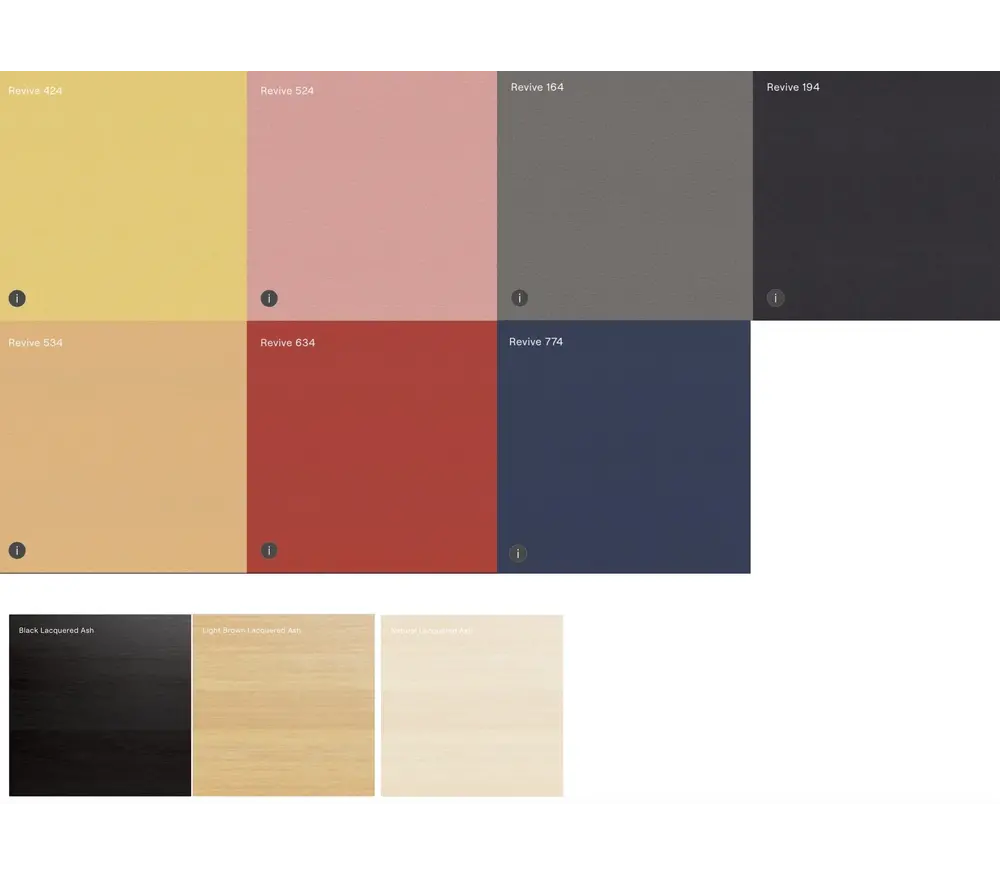 - Materiaal: s verkrijgbaar in een natuurlijke, warme of zwarte afwerking. De houten onderdelen zijn gemaakt van lagen beuken- en essenfineer, Kvadrat stof 100% gerecycled polyester