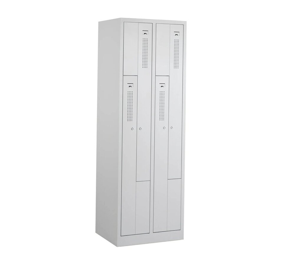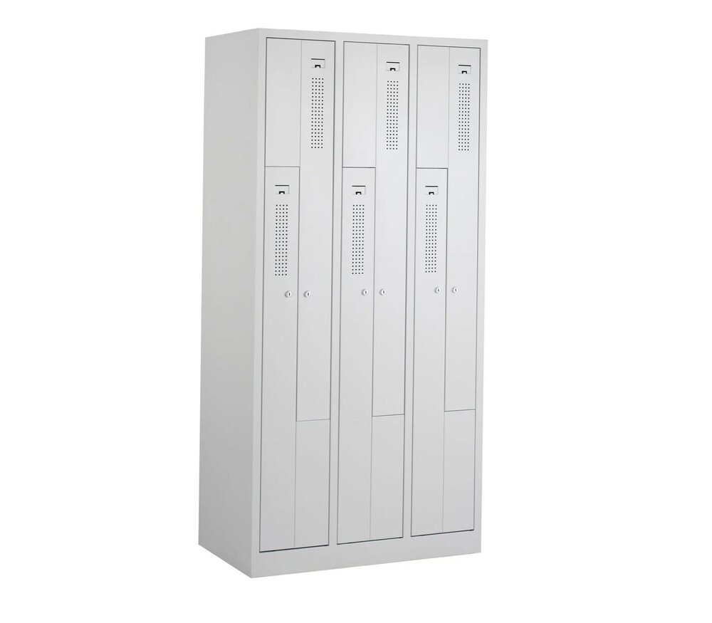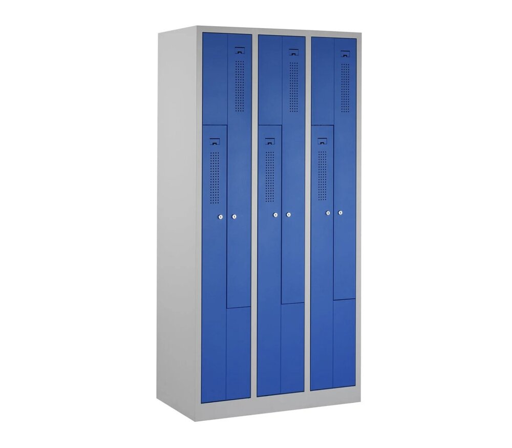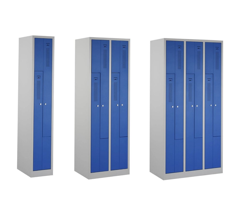 Elke deur is uitgerust met een naamkaarthouder en dubbele ventilatieprofielen, wat zorgt voor een optimale luchtcirculatie in de compartimenten. De Z-garderobekast is verkrijgbaar met cilinderslot of valgrendelslot (geschikt voor hangslot), afhankelijk van de gewenste beveiligingsgraad.